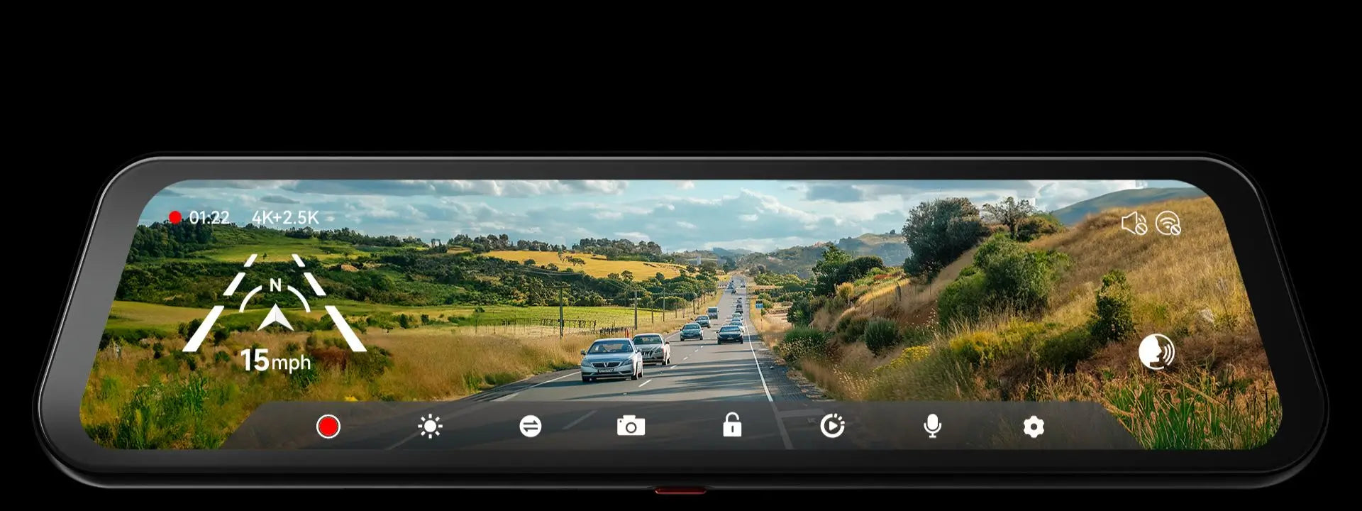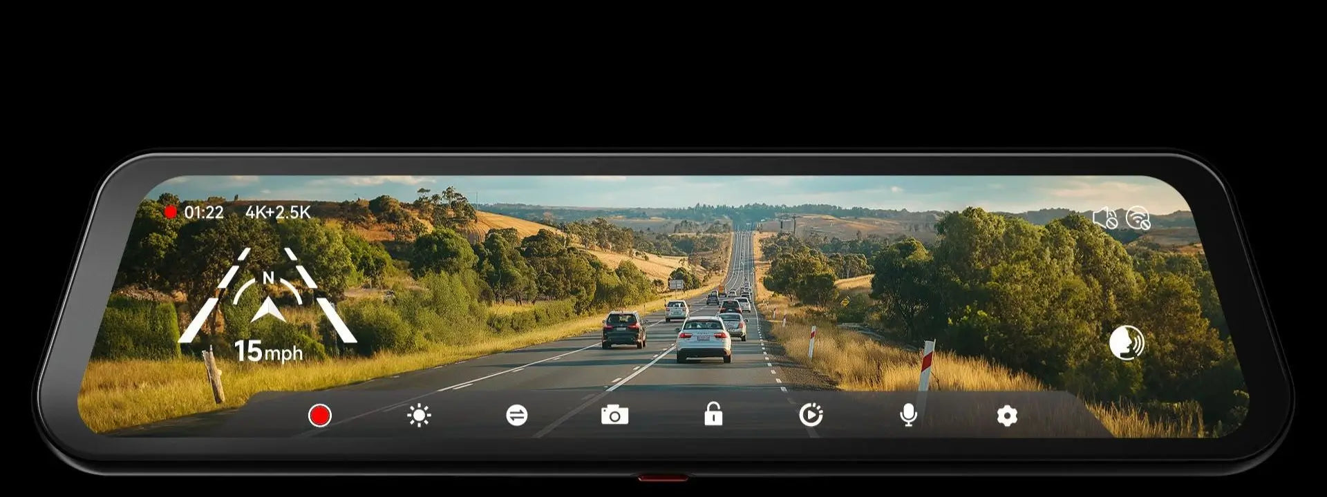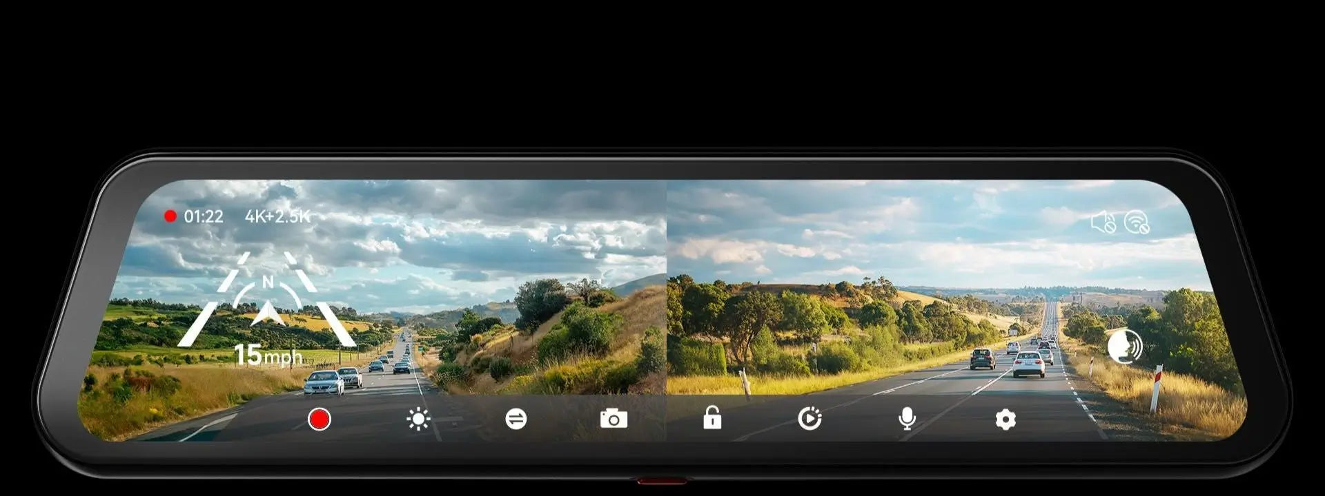 Keep your focus on the road. Use voice commands to control your dash cam effortlessly—no buttons, no distractions.Dual-View Display – Full Surround Awareness