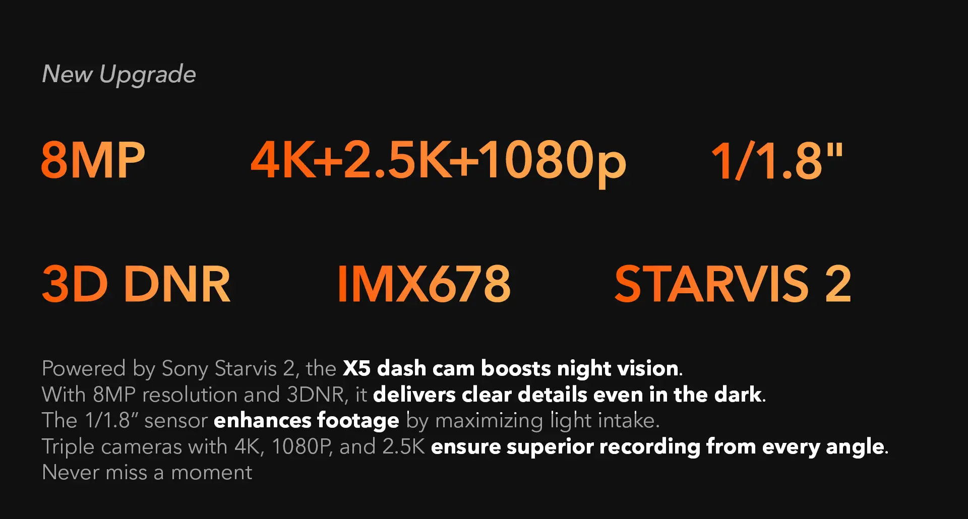 - Advanced SONY STARVIS 2 Sensor: The X5 uses the SONY STARVIS 2 IMX678 sensor for superior image quality and color reproduction. Capture detailed footage in any lighting condition.
