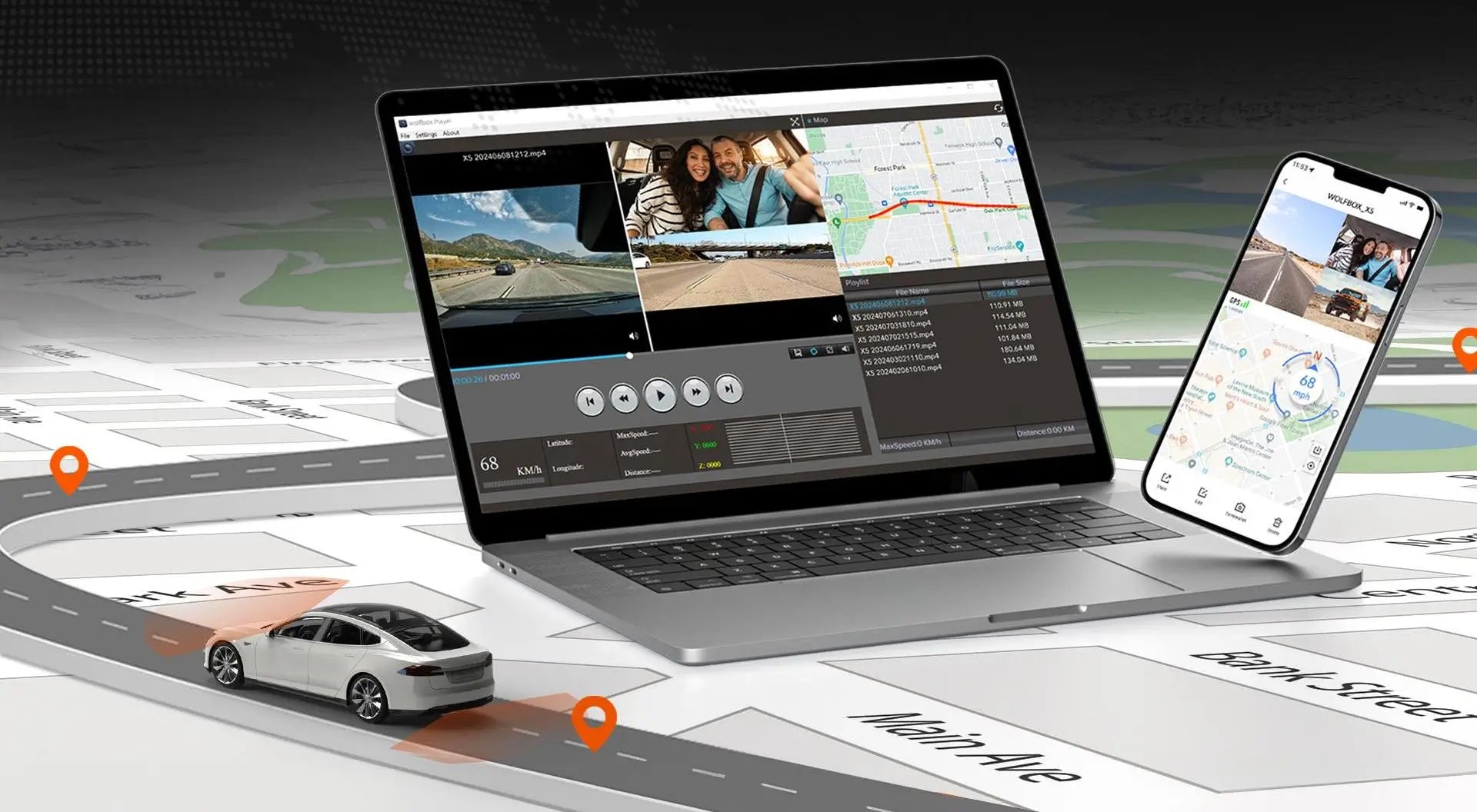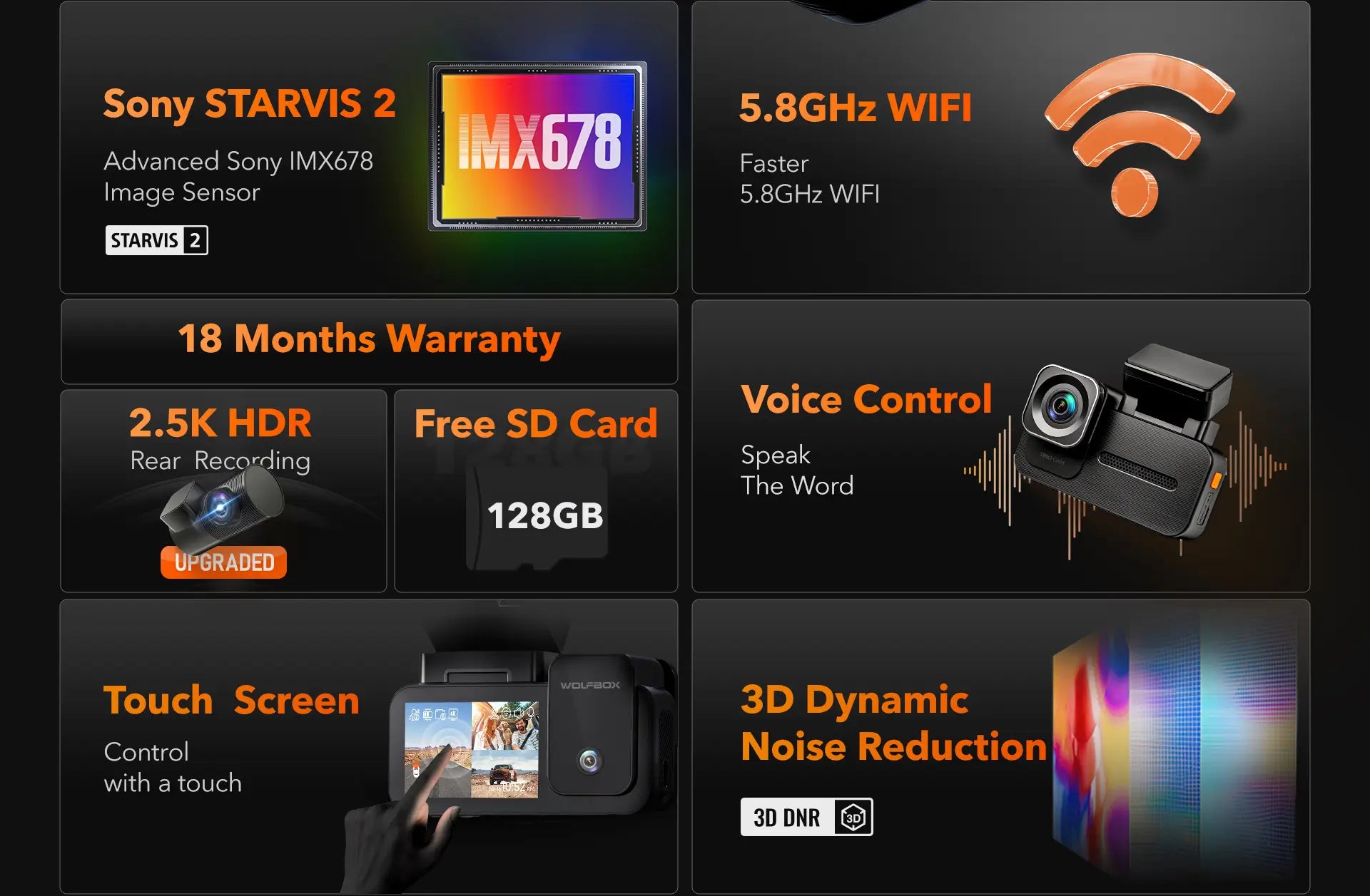 - Rapid 5.8GHz Wi-Fi & GPS Tracking: Quickly upload videos and track your vehicle’s location using 5.8GHz Wi-Fi and built-in GPS. Manage footage effortlessly through the “WOLFBOX” app.